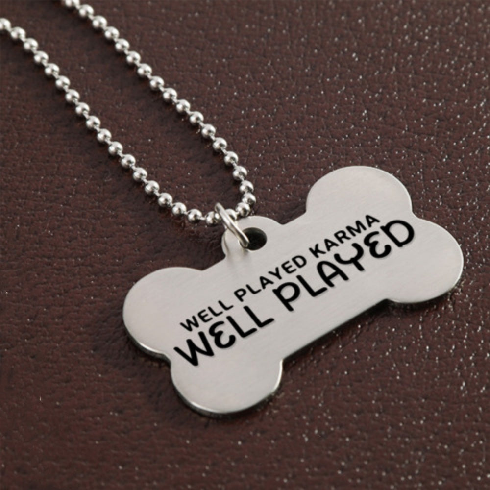Bone-shaped pet tags, personalized with pictures, text, and made of stainless steel.
